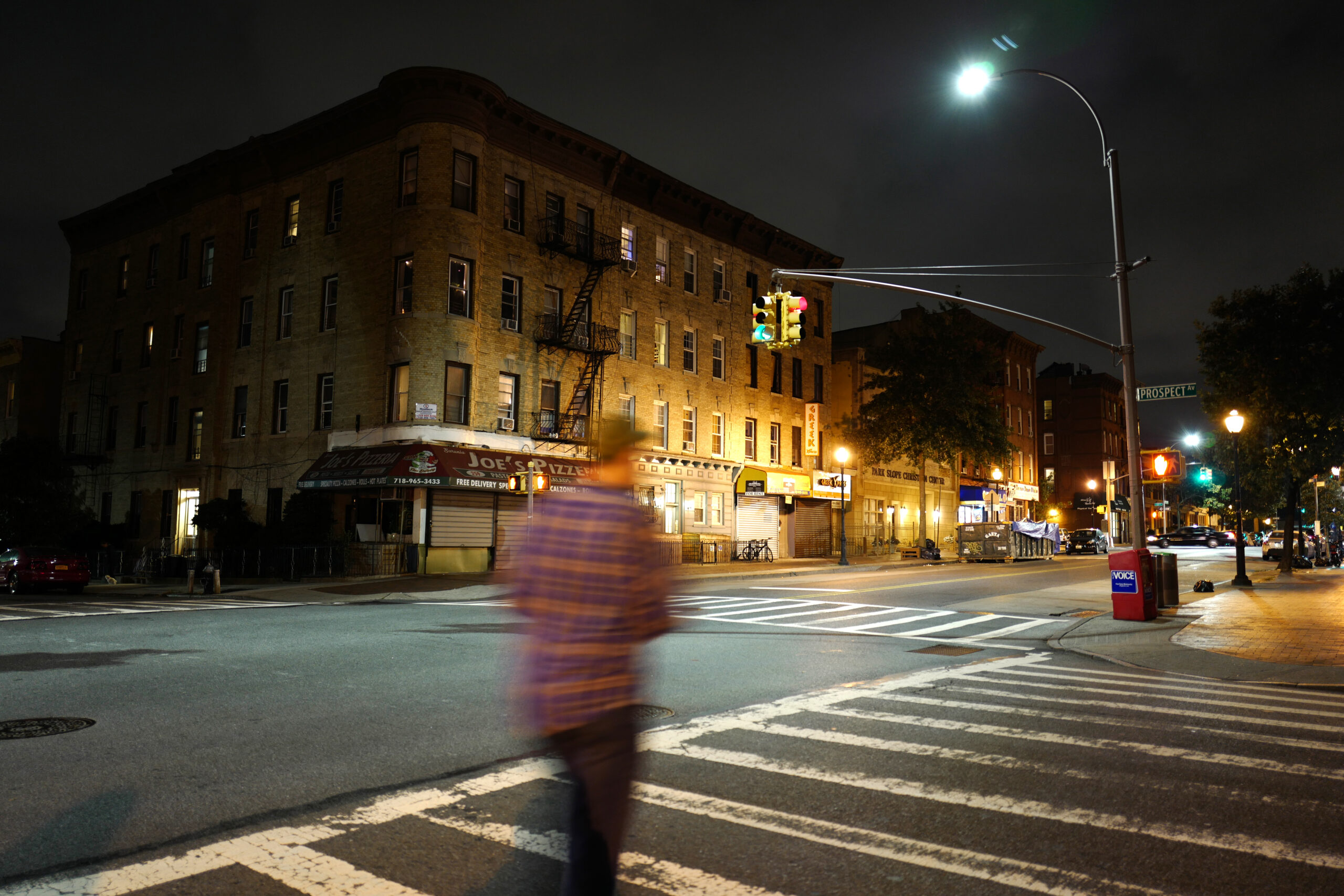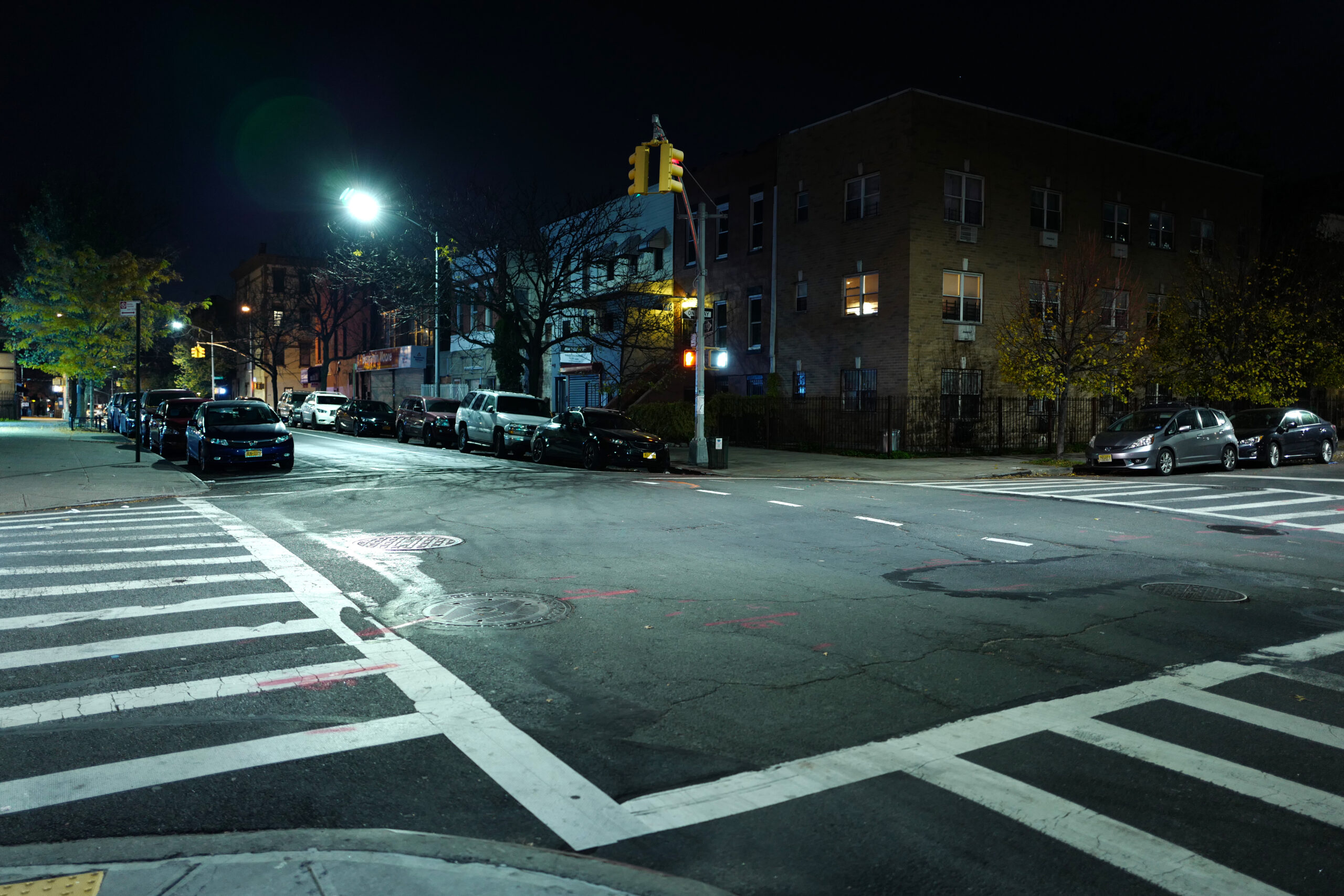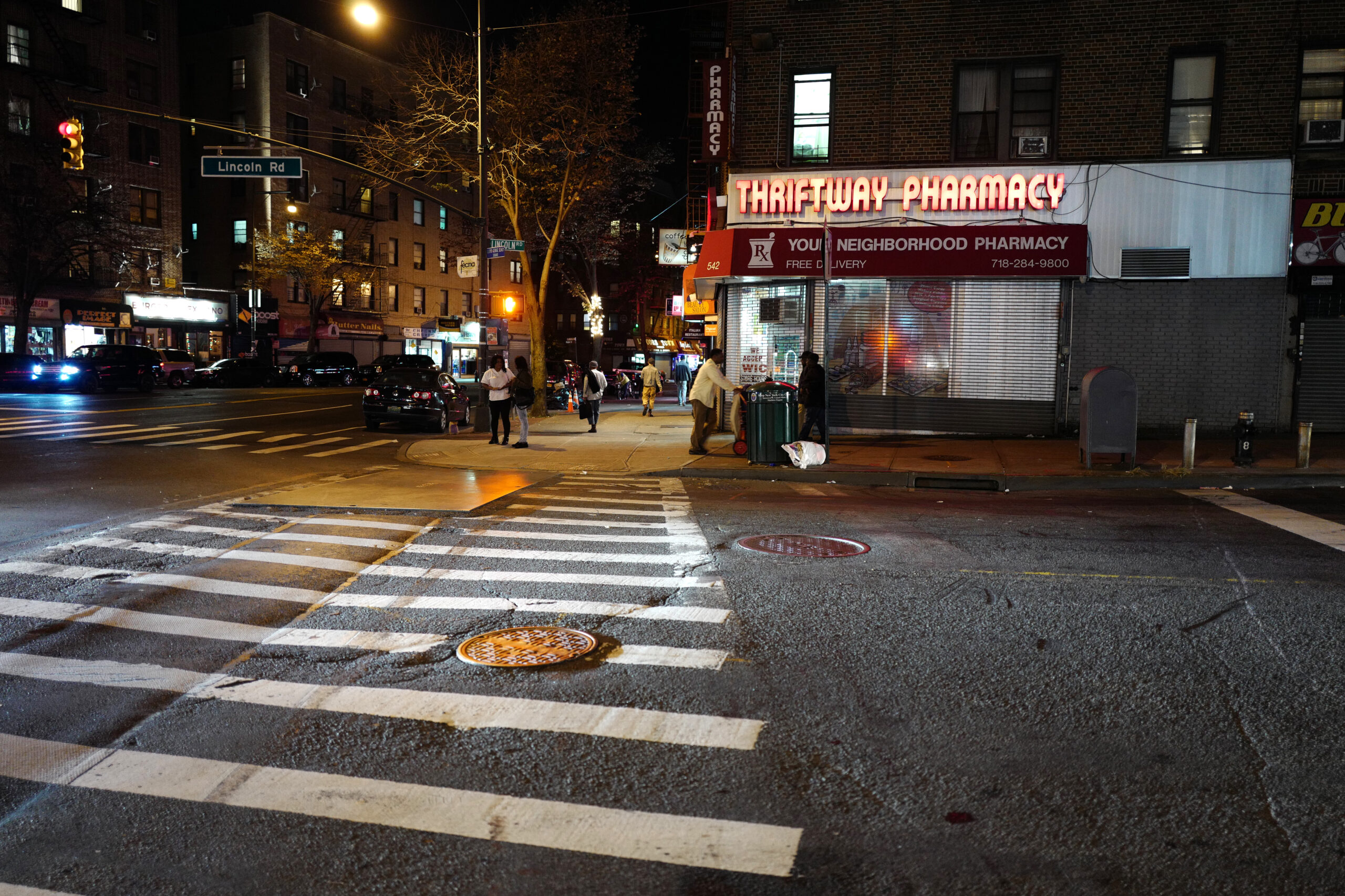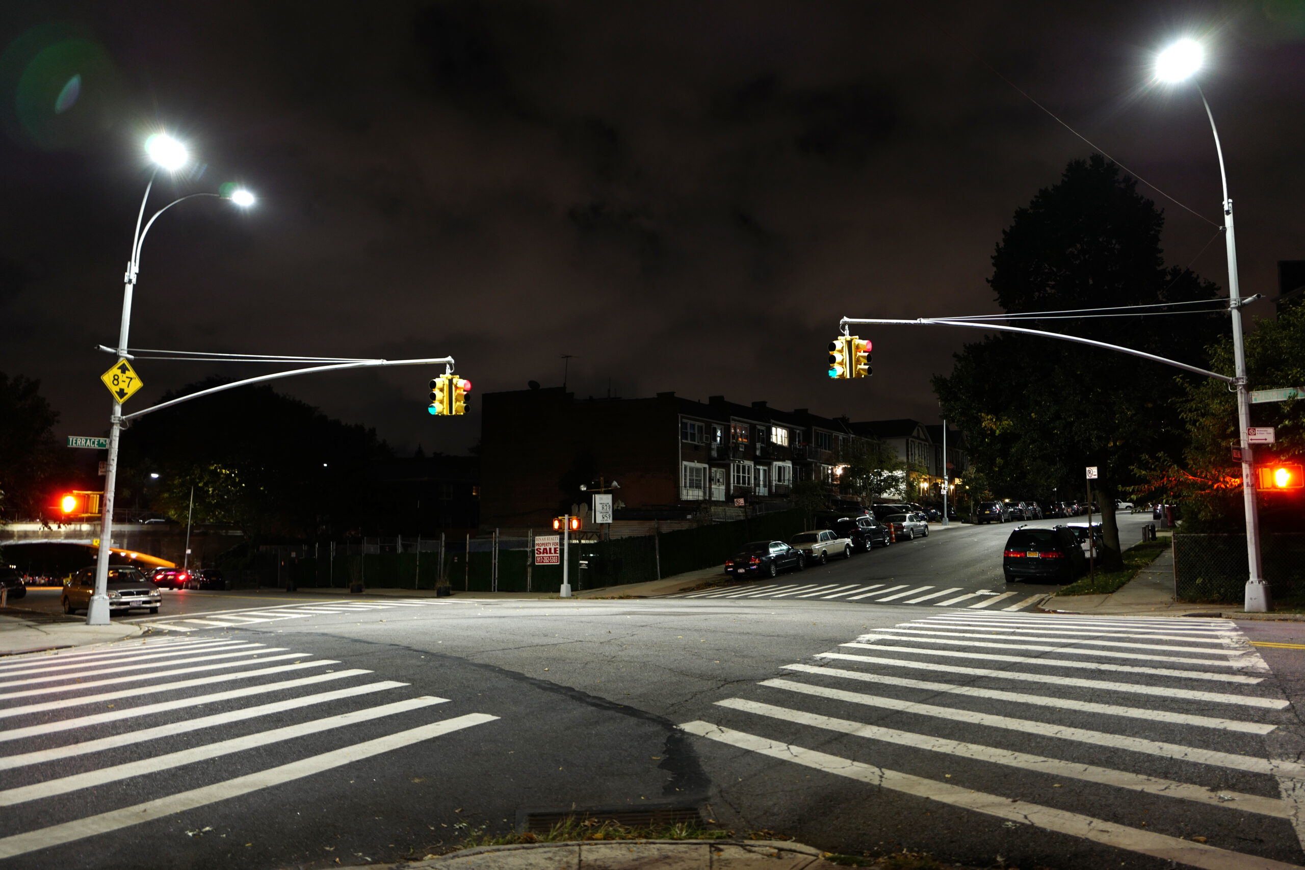 La lumière constitue une matière essentielle du travail. La nuit new-yorkaise combine des sources multiples aux températures de couleur très différentes : sodium orangé des réverbères, néons verts ou blancs des commerces, LED bleutées, phares automobiles. Ces mélanges créent des zones chromatiques hétérogènes qui transforment les volumes et modifient la perception des corps et des espaces.